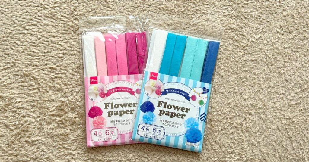 お花紙もカラーごとにダイソーで取り扱いがあり、ハサミで数センチ角に切って使うのがおすすめ。