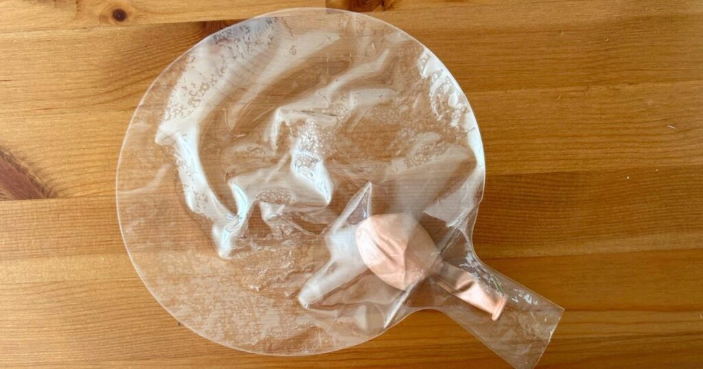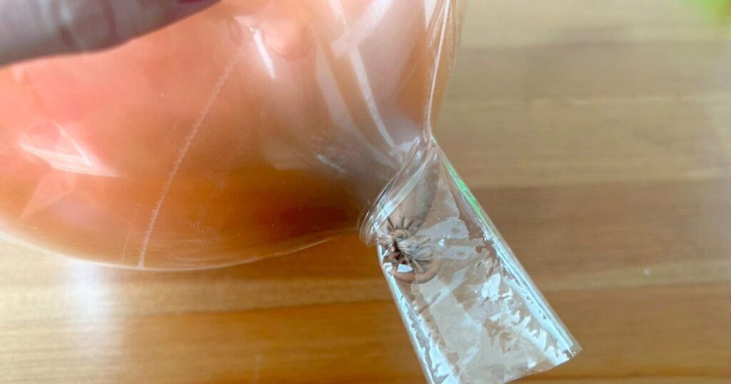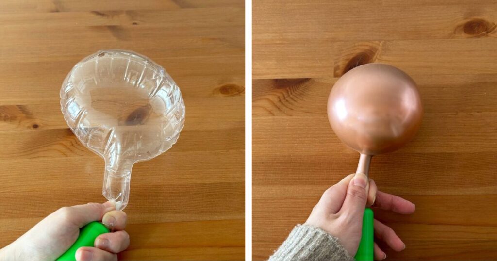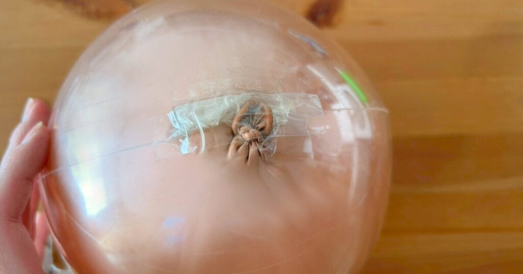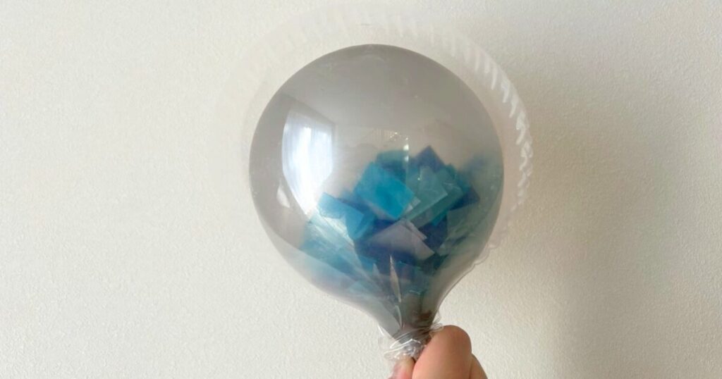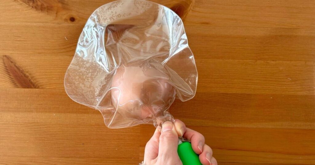 中に入れる風船からしっかり空気を抜き、外用のクリア風船の中に入れます。